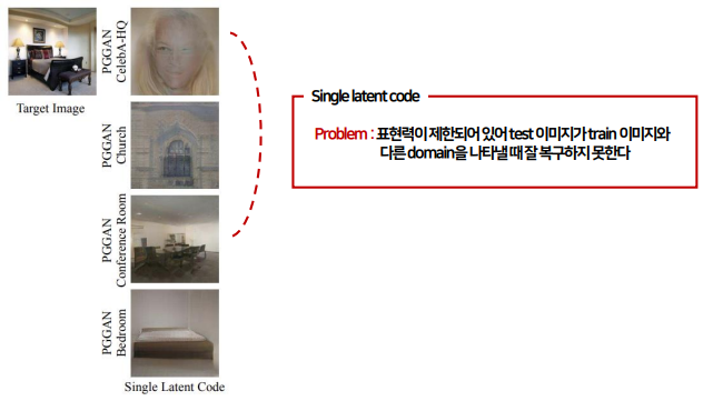 이미지를 latent code로 invert하면 이 문제를 해결할 수 있지만 현존하는 방법들은 이미지를 복구했을 때 quality가 낮으며 single latent code로는 이미지의 세부적인 특징을 학습하기 어렵다는 한계가 있다.