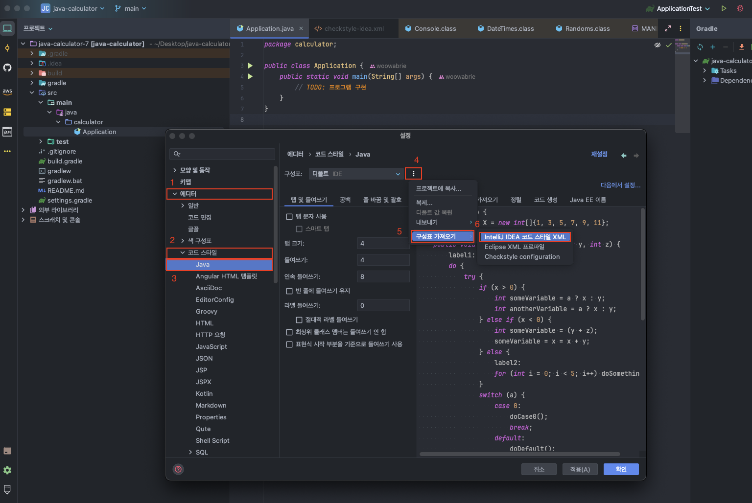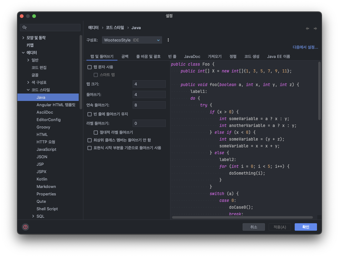 Settings(설정) - Editer(에디터) - Code Style(코드 스타일) - Java 창 열기