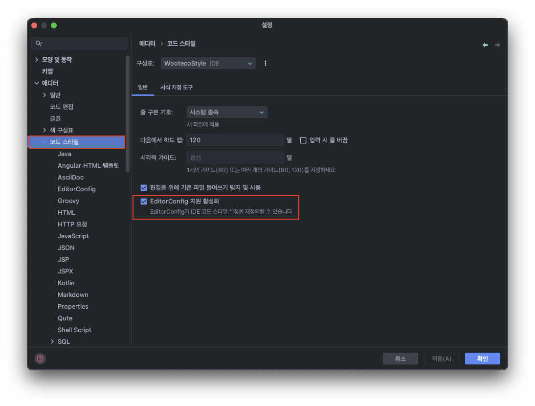 Code Style(코드 스타일) 의 Enable EditorConfig support(EditorConfig 지원 활성화) 설정 체크 후 적용
