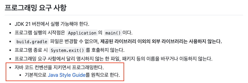 나는 미션에서 제시된 요구 사항을 충족하는 것을 중요하게 생각한다. 그래서 첫 미션을 시작하기 전에 우테코에서 제공한 요구 사항을 꼼꼼히 확인해보았다. 그 중 자바 코드 컨벤션을 준수하며 프로그래밍하기라는 항목이 있었는데, 이 요구 사항을 지키면서 코딩하는 것이 생각보다 많은 시간과 노력이 필요하다는 것을 알게 되었다.
