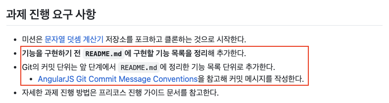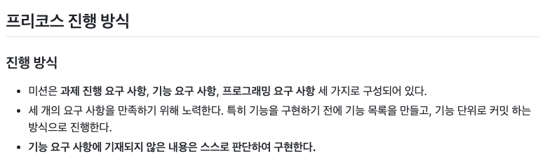 프리코스 미션의 요구 사항으로는 과제 진행 요구 사항, 기능 요구 사항, 프로그래밍 요구 사항 세 가지로 구성되어 있다.