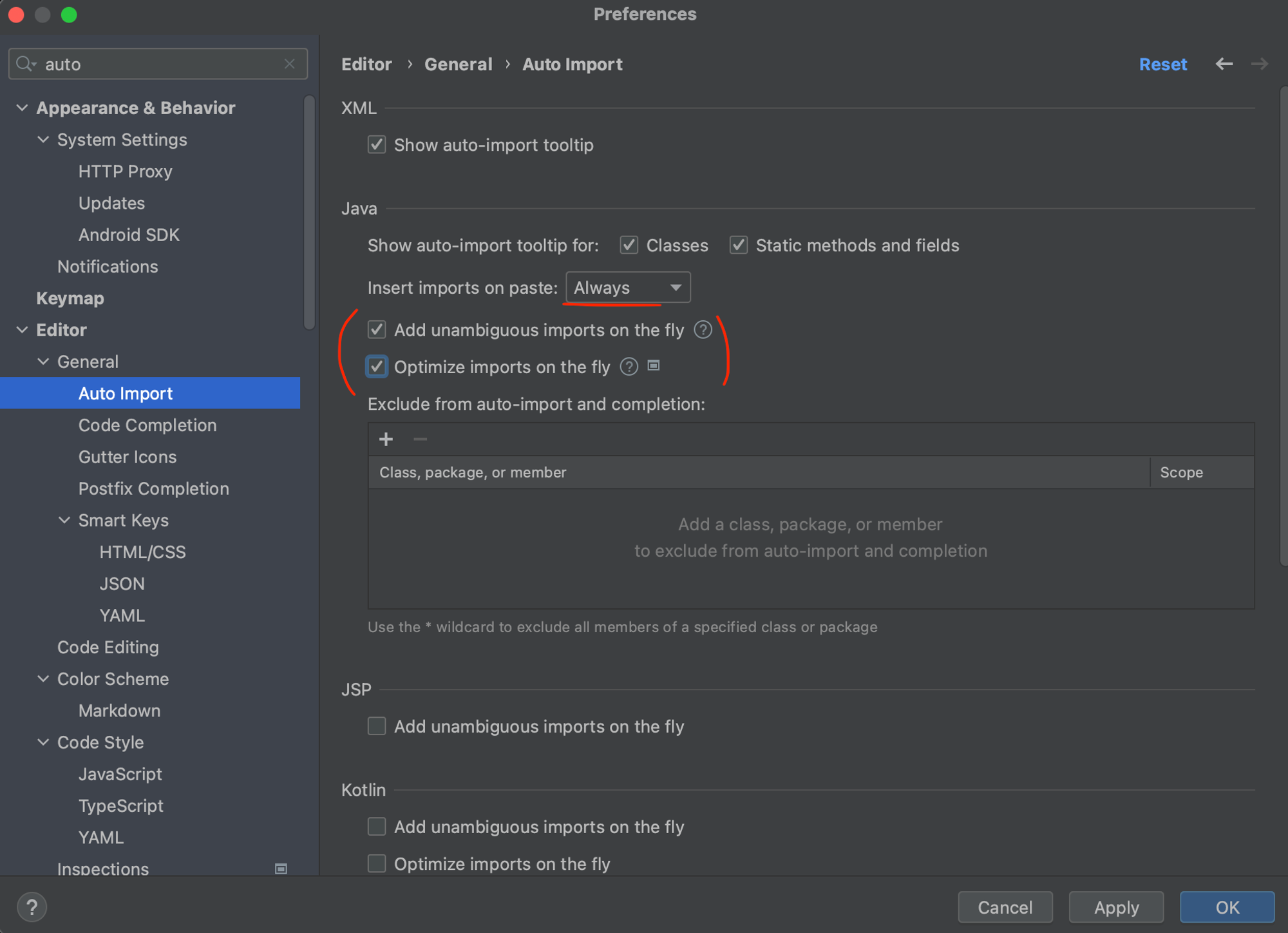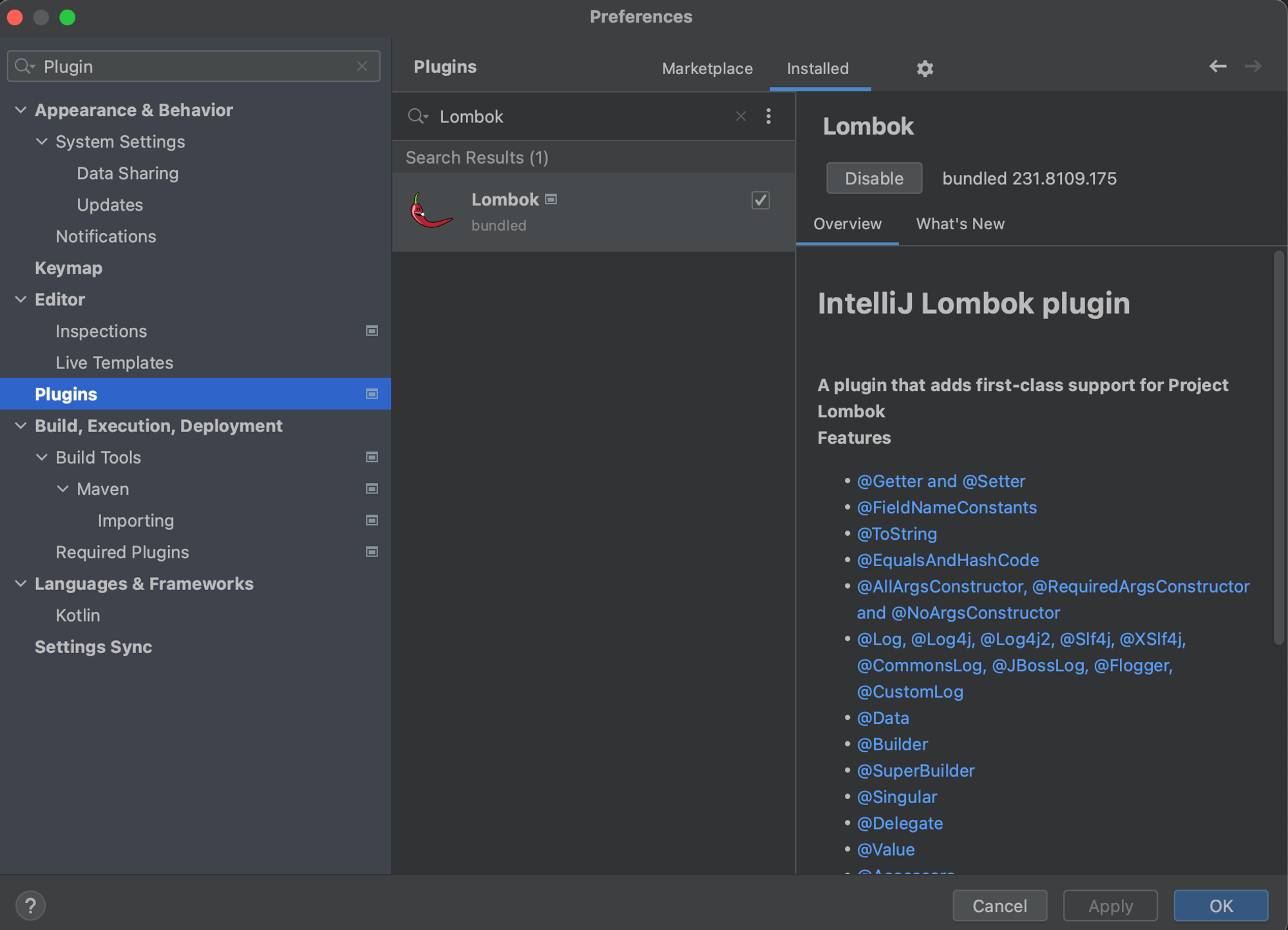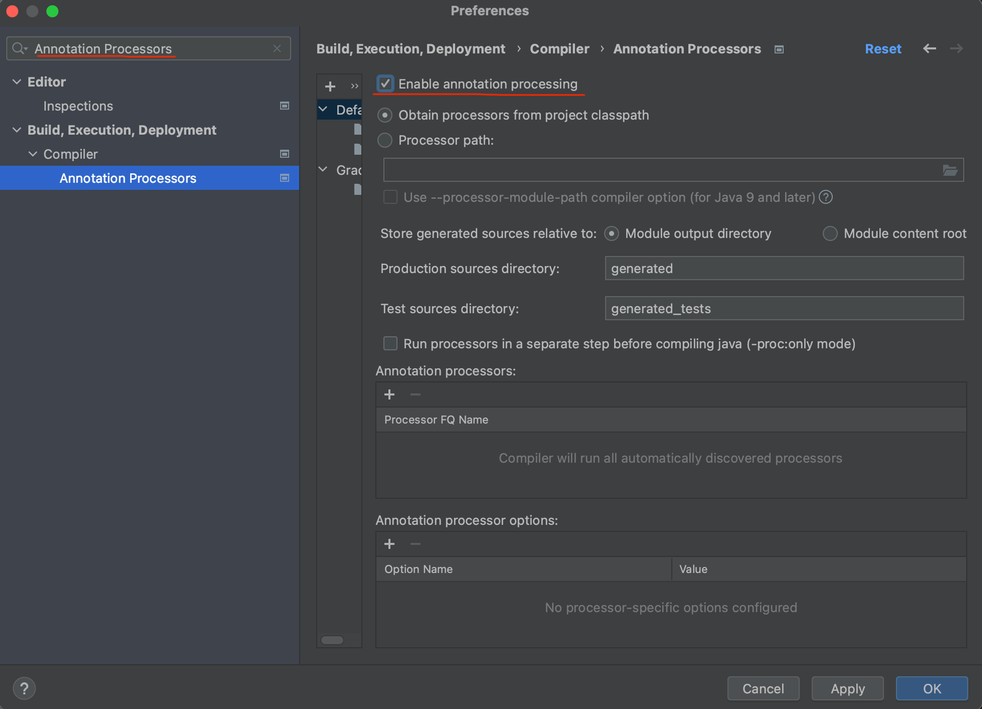 - 검색창에 Annotaion Processors 검색한 뒤 Enable~ 체크 후 Apply
