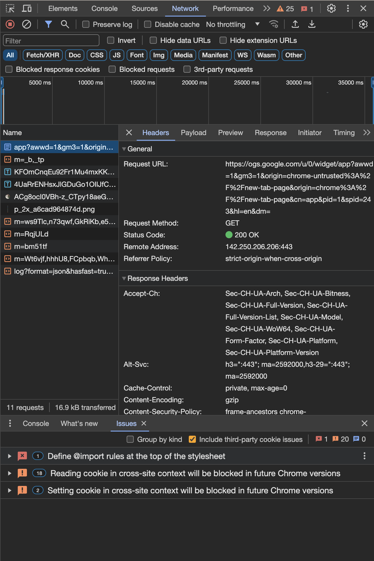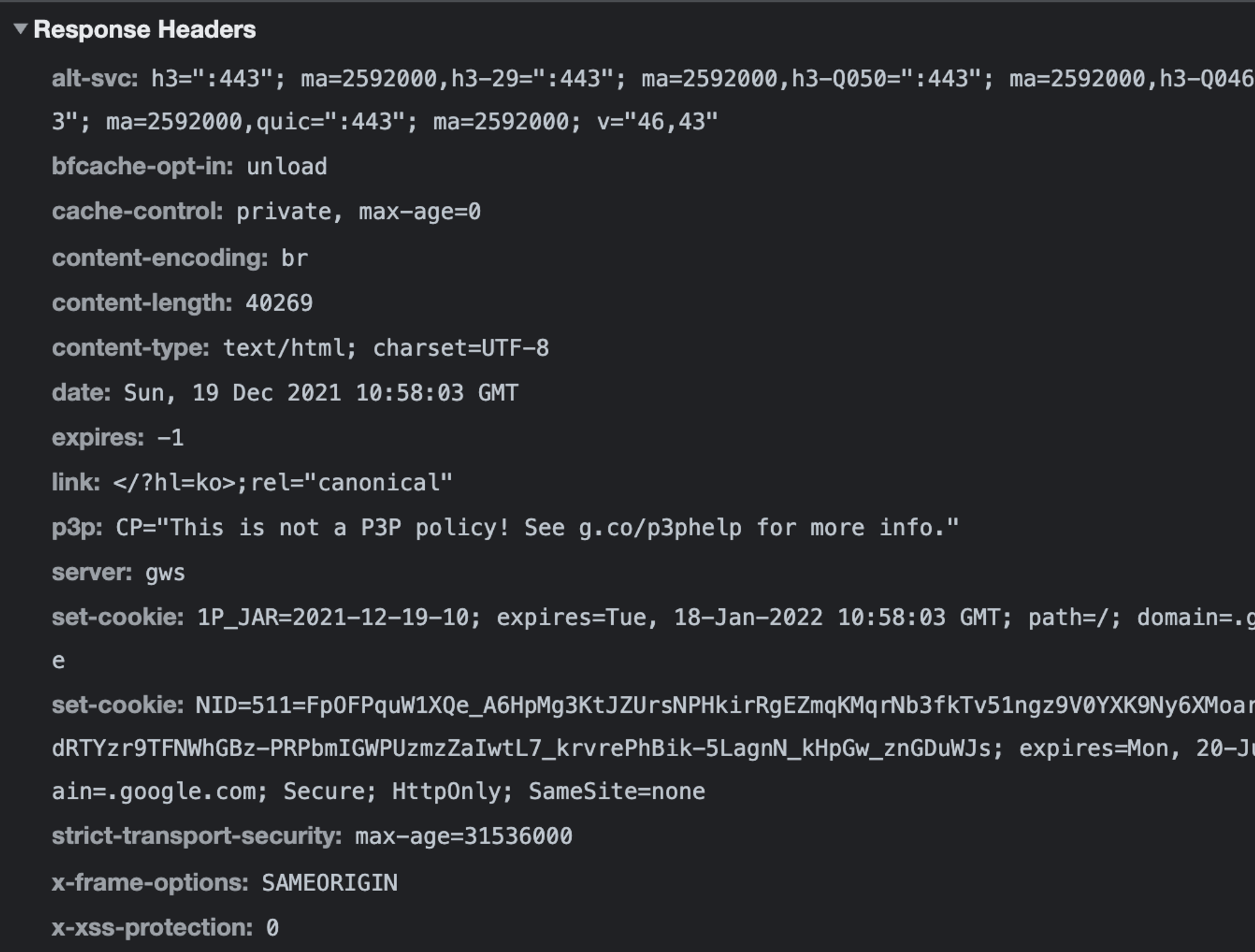 Response Headers : 서버가 웹 페이지 데이터와 함께 보낸 추가 데이터