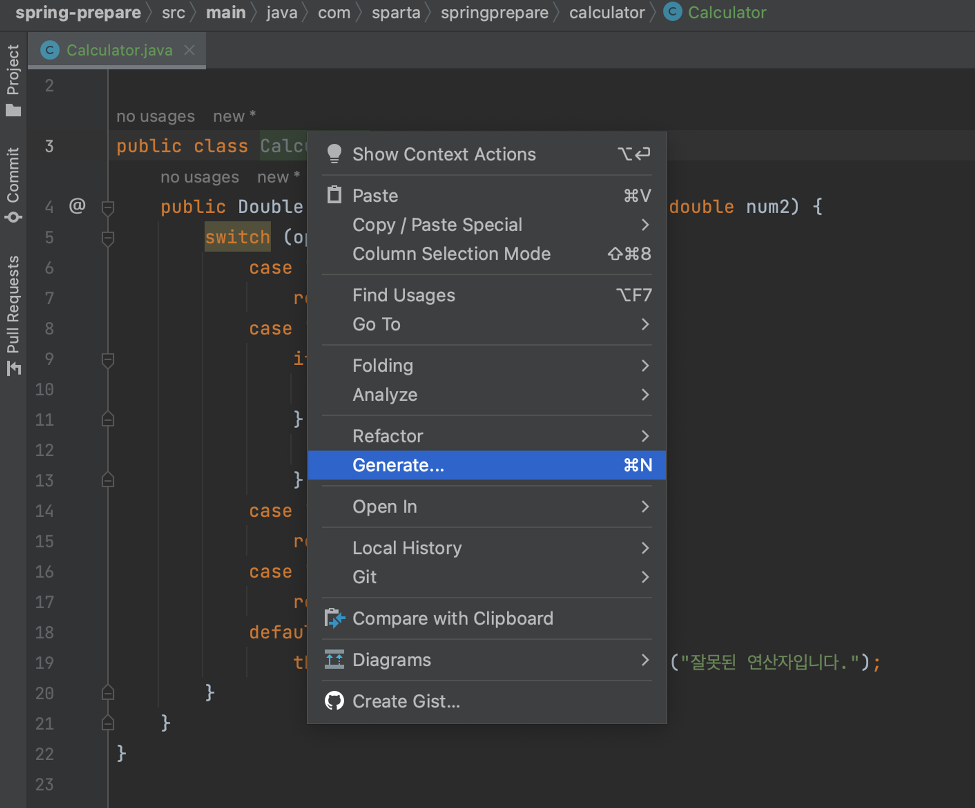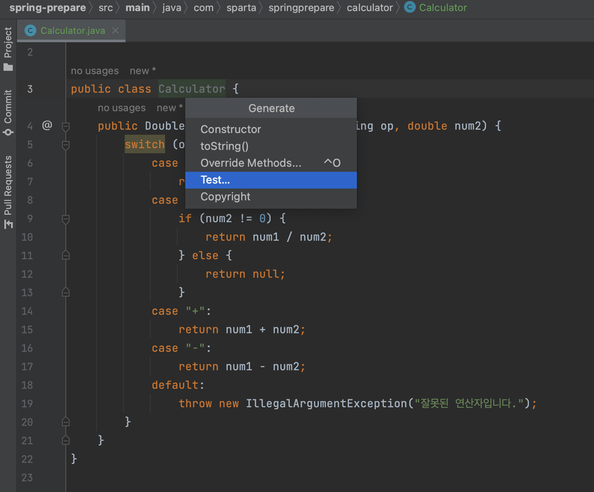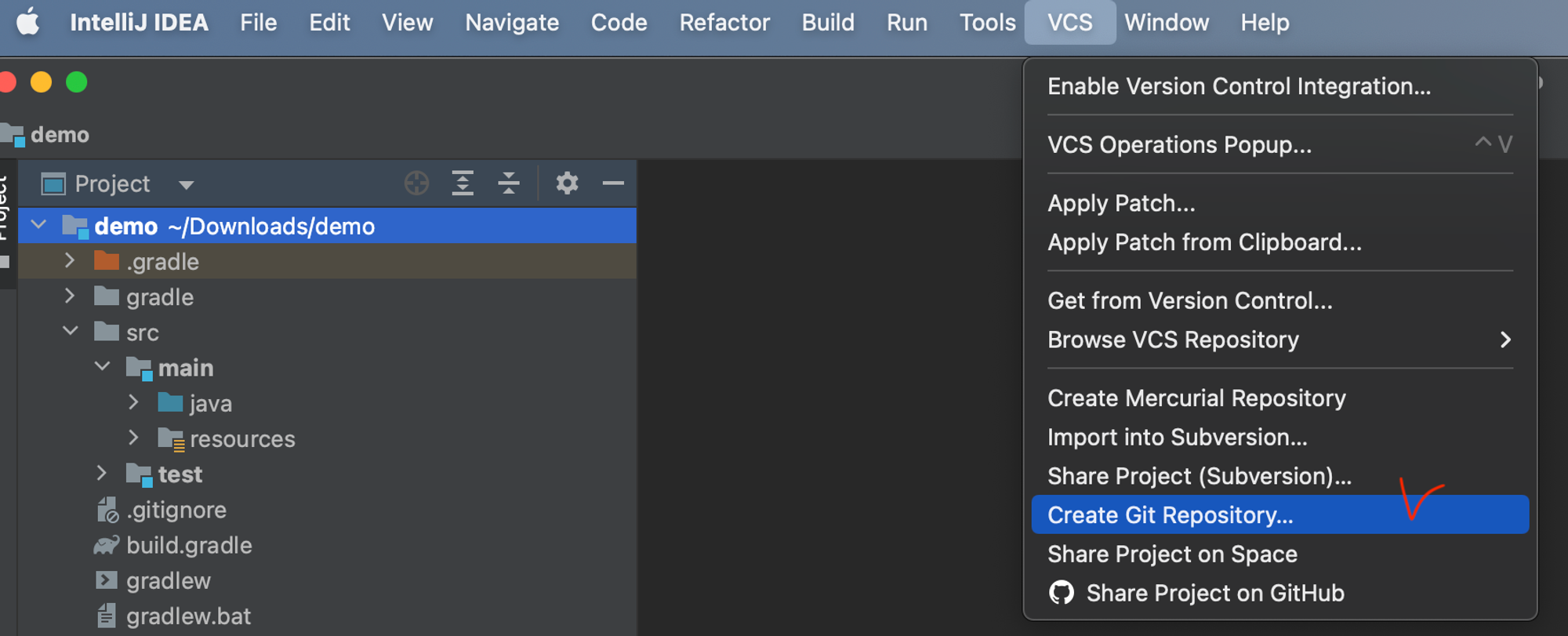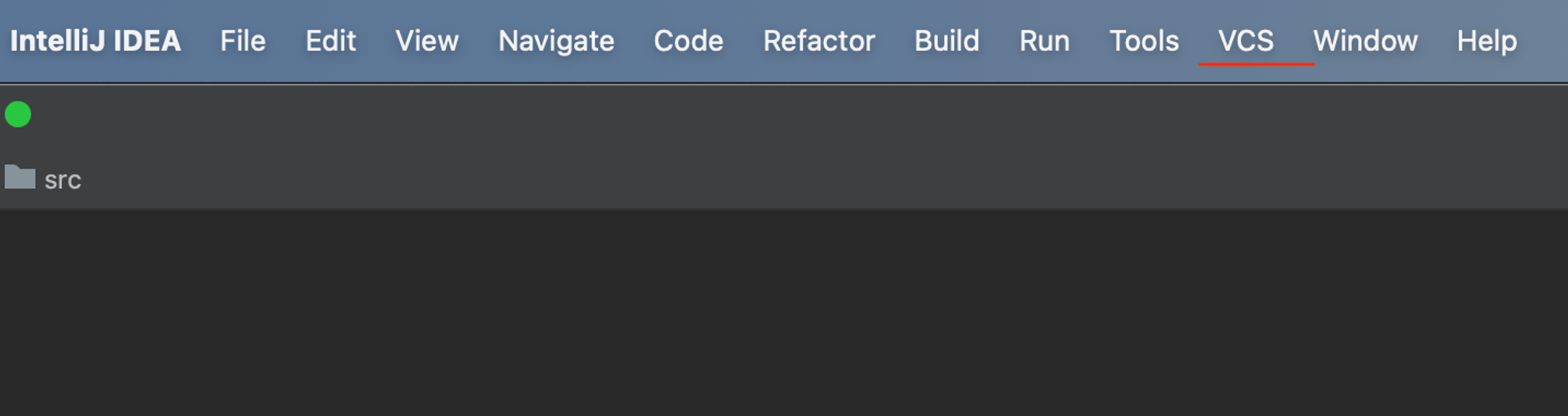 - 메뉴에서 VCS 선택 (프로젝트 생성할 때 Create Git Repository 체크하면 git으로 뜸)