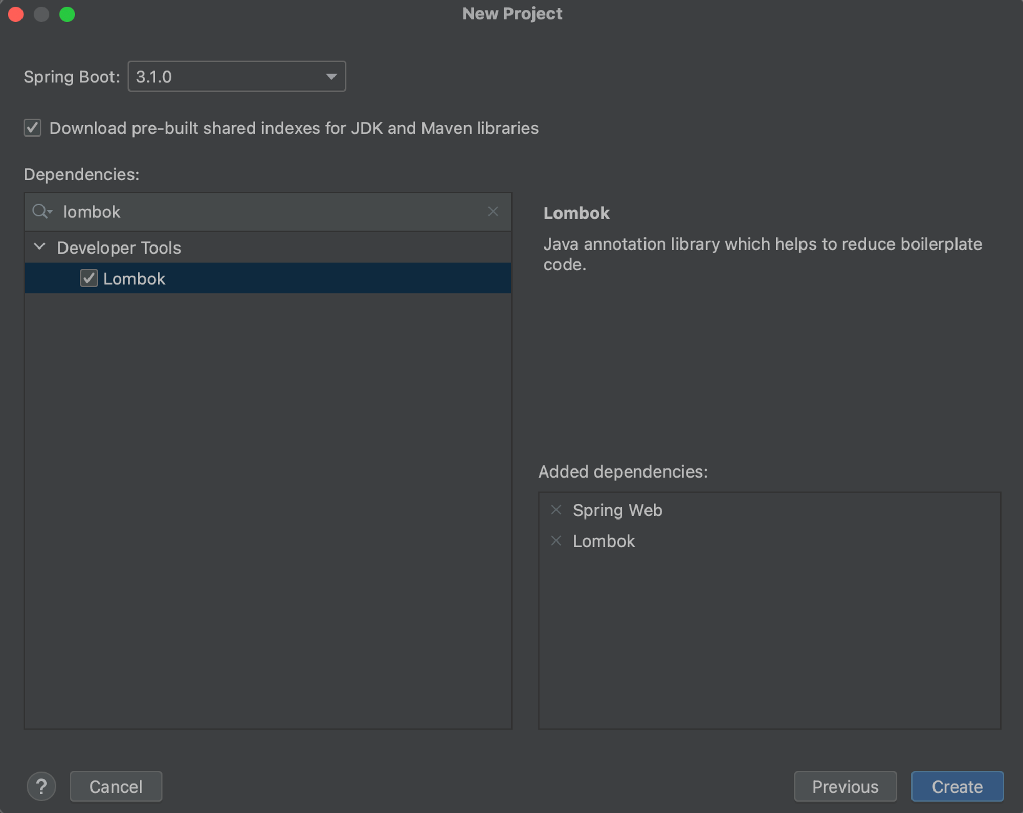 6️⃣ Dependencies를 아래 사진과 같이 추가해주고 Create를 클릭합니다.