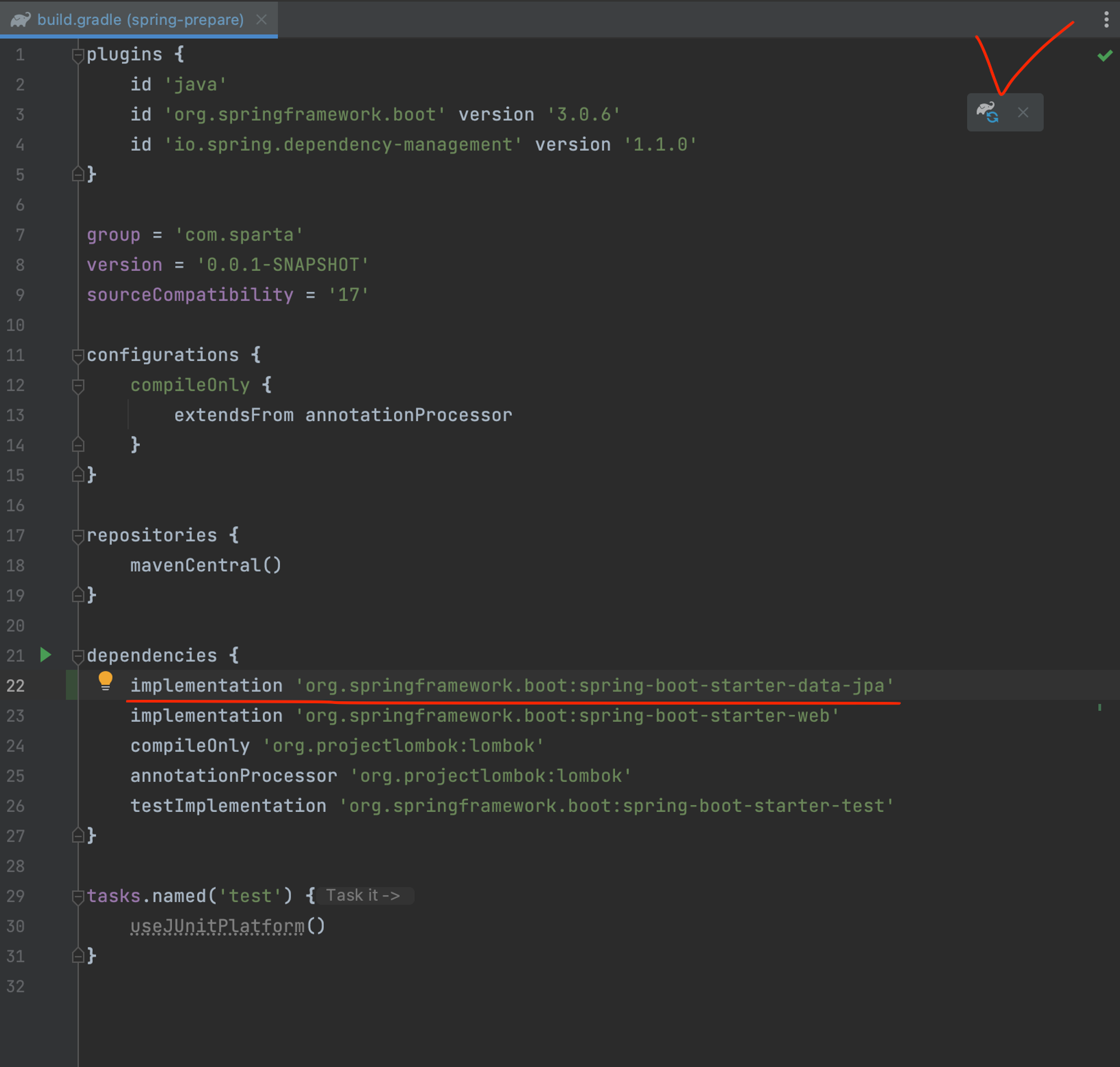 필요로하는 라이브러리를 추가시 코끼리 모양의 버튼 생성