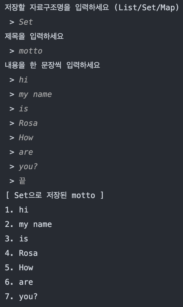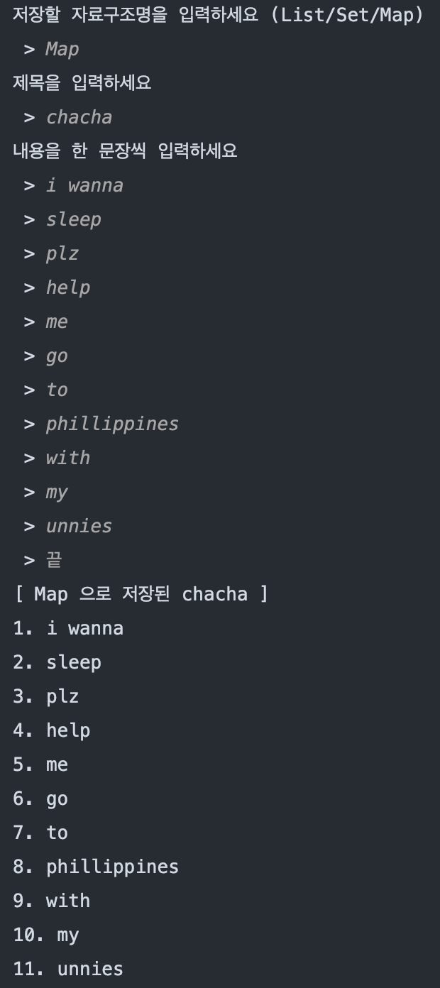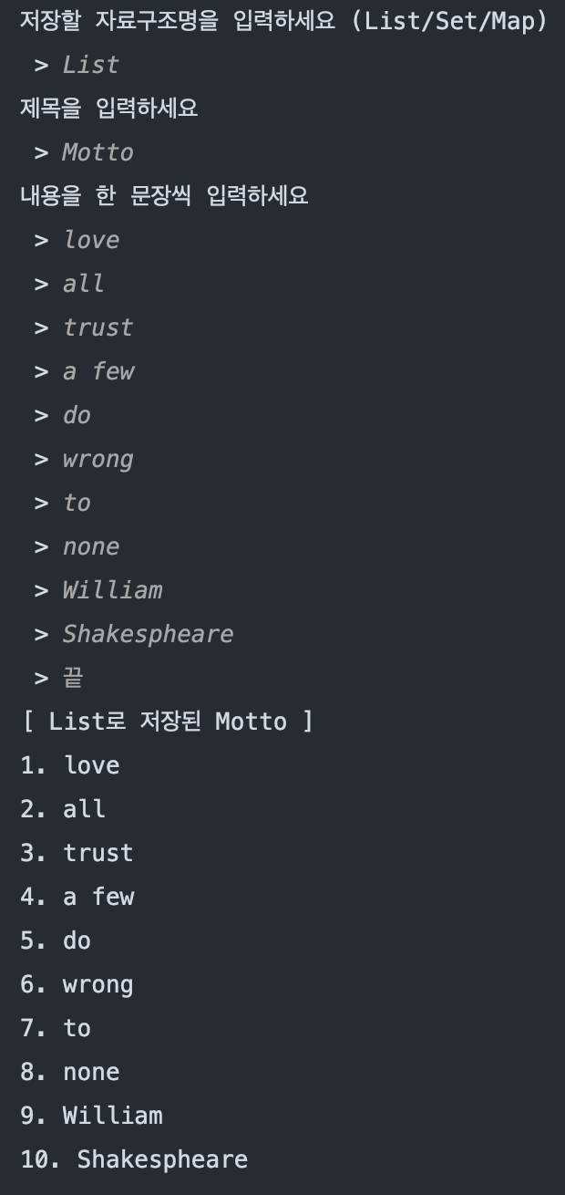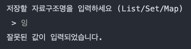 // - 저장할 자료구조명을 입력합니다. (List / Set / Map)