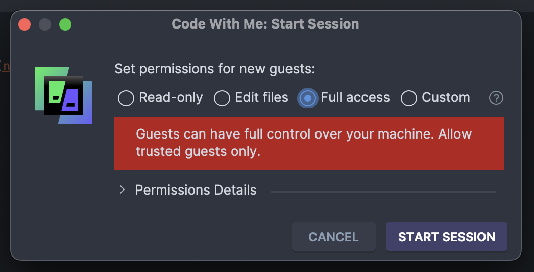 3๏ธโฃ ์ด๋ฐ ์ฐฝ์ด ๋จ๋ฉด permission์ ํ์ธํ๊ณ Start session ๋ฒํผ์ ๋๋ฅธ๋ค. ๋ด ๊ฒฝ์ฐ์๋ ์ฝ๋๋ฅผ ํจ๊ป ์ง๊ธฐ ์ํด์ Full access๋ฅผ ์ ํํ๋ค.