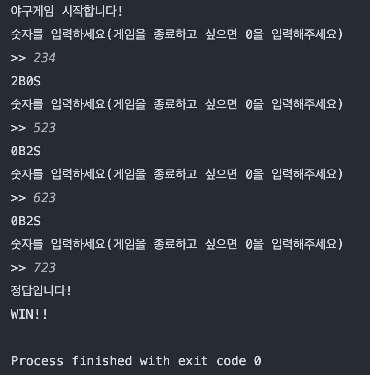 ์ด๊ฑด ํ ๋ฒ์ ์งํํ๋ค. ์๊น ๋ฐ์์จ int๊ฐ์ main method์ ๋ค๋ฅธ ๋ณ์์ ์ง์ด ๋ฃ๊ณ if ~ else if๋ฅผ ์ด์ฉํด์ ์ ๋ต์ด ์๋๋ฉด(strike != 3) ๋ณผ๊ณผ ์คํธ๋ผ์ดํฌ ๊ฐ์๋ฅผ ์๋ ค์ฃผ๊ณ ๋ค์ while๋ฌธ์ ๋ฐ๋ณตํ๊ณ , ์ ๋ต์ด๋ฉด (strike == 3) ์ ๋ต์ด๋ผ๊ณ ์๋ ค์ค ๋ค while๋ฌธ์ ์ข ๋ฃํ๋ค.