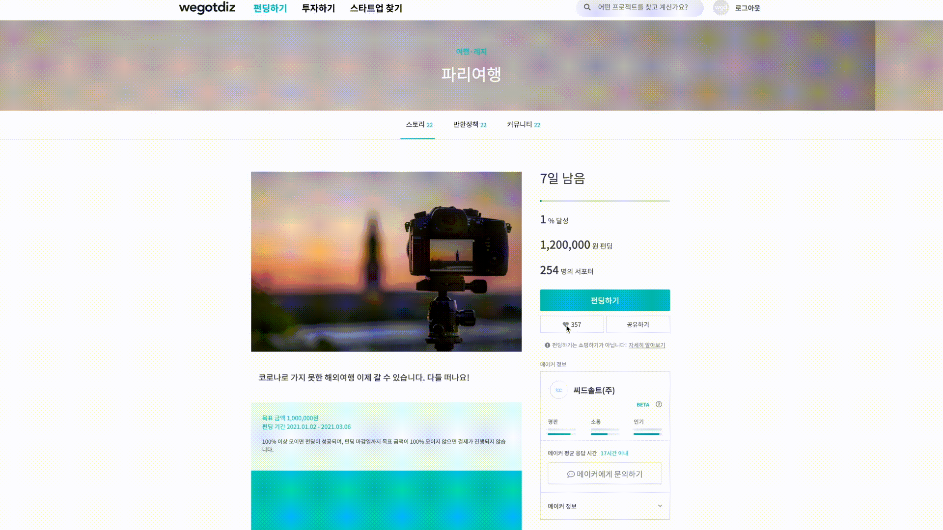 국내 대표 크라우드 펀딩 서비스 중 하나이며 리워드 펀딩 외에도 투자 및 펀딩 스쿨 등 다양한 영역으로 사업을 확장해나가고 있다. 이러한 다양한 서비스들 중 우리 팀은 크라우드 펀딩 서비스의 한 사이클을 구현하고자 하였다.