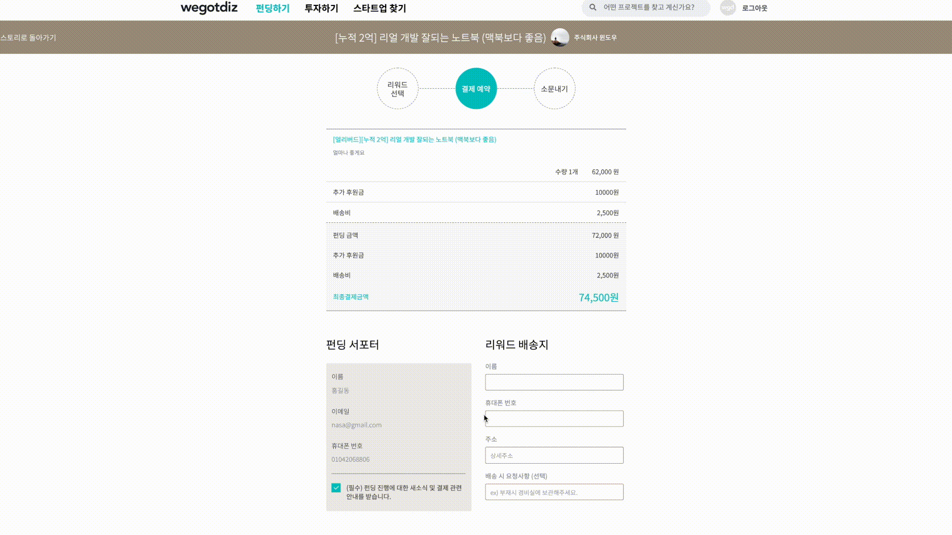 이전 단계에서 선택된 리워드의 결제 예정인 내역과 유저의 기본 정보가 출력된다. 회원가입 단계에서 주소 정보를 기입하지 않기 때문에 리워드 발송이 필요한 경우 리워드 배송지를 입력하도록 구현하였다.