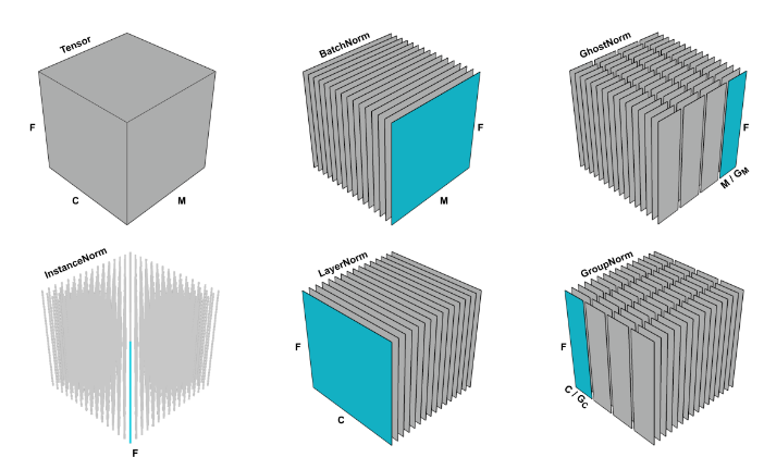 상단의 그림은 배치 정규화 외에도 특징 맵을 3차원 시각화 했을 때 정규화가 수행되는 방식을 보여준다. 한 블록을 이미지나 텍스트 데이터라 한다면, 차원(F)은 이미지 데이터의 크기 혹은 어휘 사전의 크기를 말하고, 채널(C)의 경우 이미지 데이터의 채널이나 시간 간격을 의미한다.