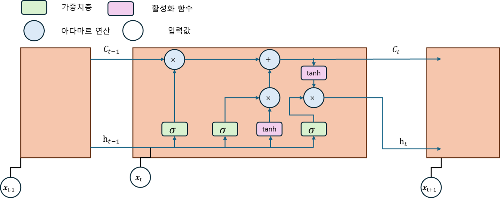 위 그림은 장단기 메모리의 구조를 보여준다. 장단기 메모리는 셀 상태(Cell state)와 망각 게이트(Forget gate), 기억 게이트(Input gate), 출력 게이트(Output gate)로 정보의 흐름을 제어한다.
