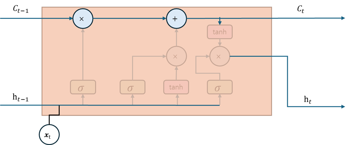 위 그림은 장단기 메모리 셀 상태의 연산 괒어을 보여준다. 메모리 셀은 순환 신경망의 은닉 상태와 유사하게 현재 시점의 입력과 이전 시점의 은닉 상태를 기반으로 정보를 계산하고 저장하는 역할을 한다. 하지만 순환 신경망에서 은닉 상태는 출력값을 계산하는 데 사용되지만, 장단기 메모리의 메모리 셀은 출력값 계산에 직접 사용되지 않는다.