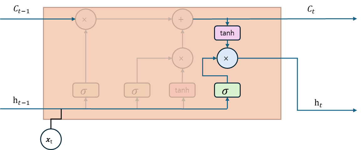 마지막 출력 게이트는 현재 시점의 입력과 이전 시점의 은닉 상태, 그리고 새로 업데이트된 메모리 셀을 입력으로 받아 현재 시점의 출력값을 계산한다.
