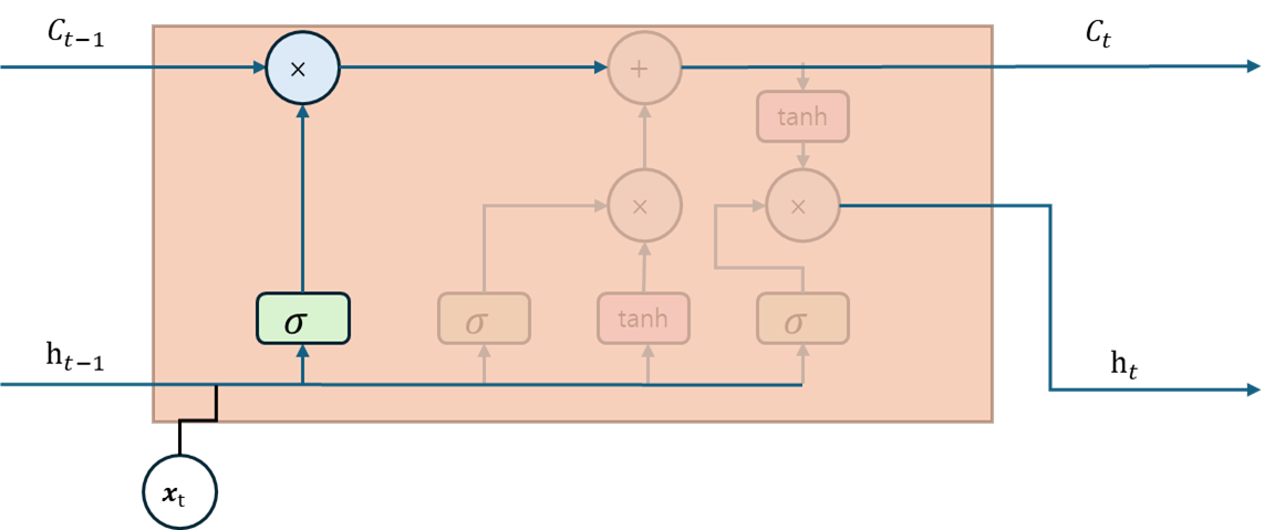 예를 들어, 망각 게이트가 1을 출력하면, 이전 시점의 기억 상태가 완전히 유지되며 0이 출력되면 이전 시점의 기억 상태는 현재 시점의 기억 상태에 전혀 반영되지 않는다.