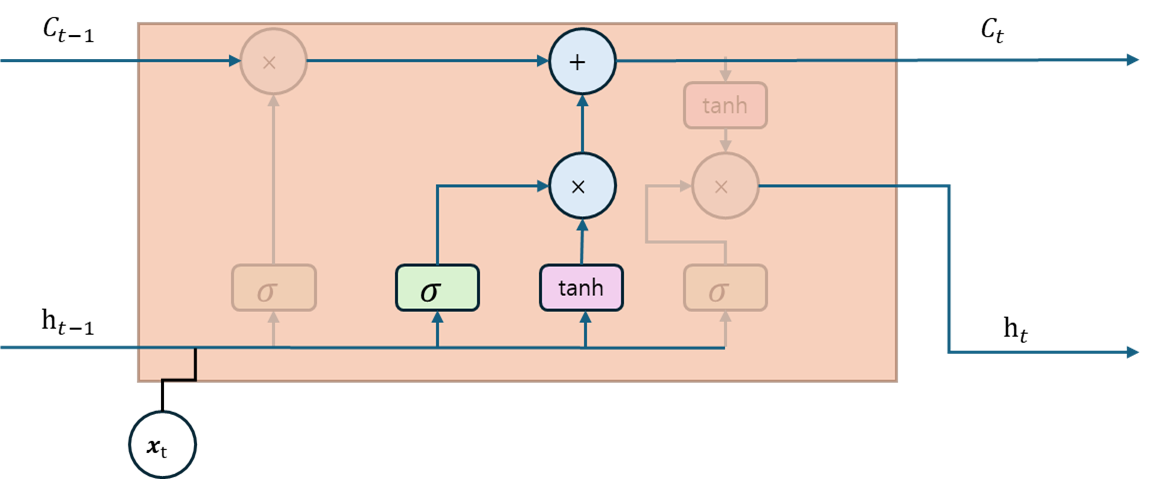 입력 게이트는 새로운 정보를 어떤 부분에 추가할지 결정하는 역할을 하며 현재 입력과 이전 셀 상태를 입력으로 받아 어떤 정보를 추가할지 결정한다.