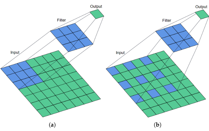 출처 : Bearing Fault Diagnosis via Improved One-Dimensional Multi-Scale Dilated CNN, (a) Dilation value = 1, (b) Dilation value = 2