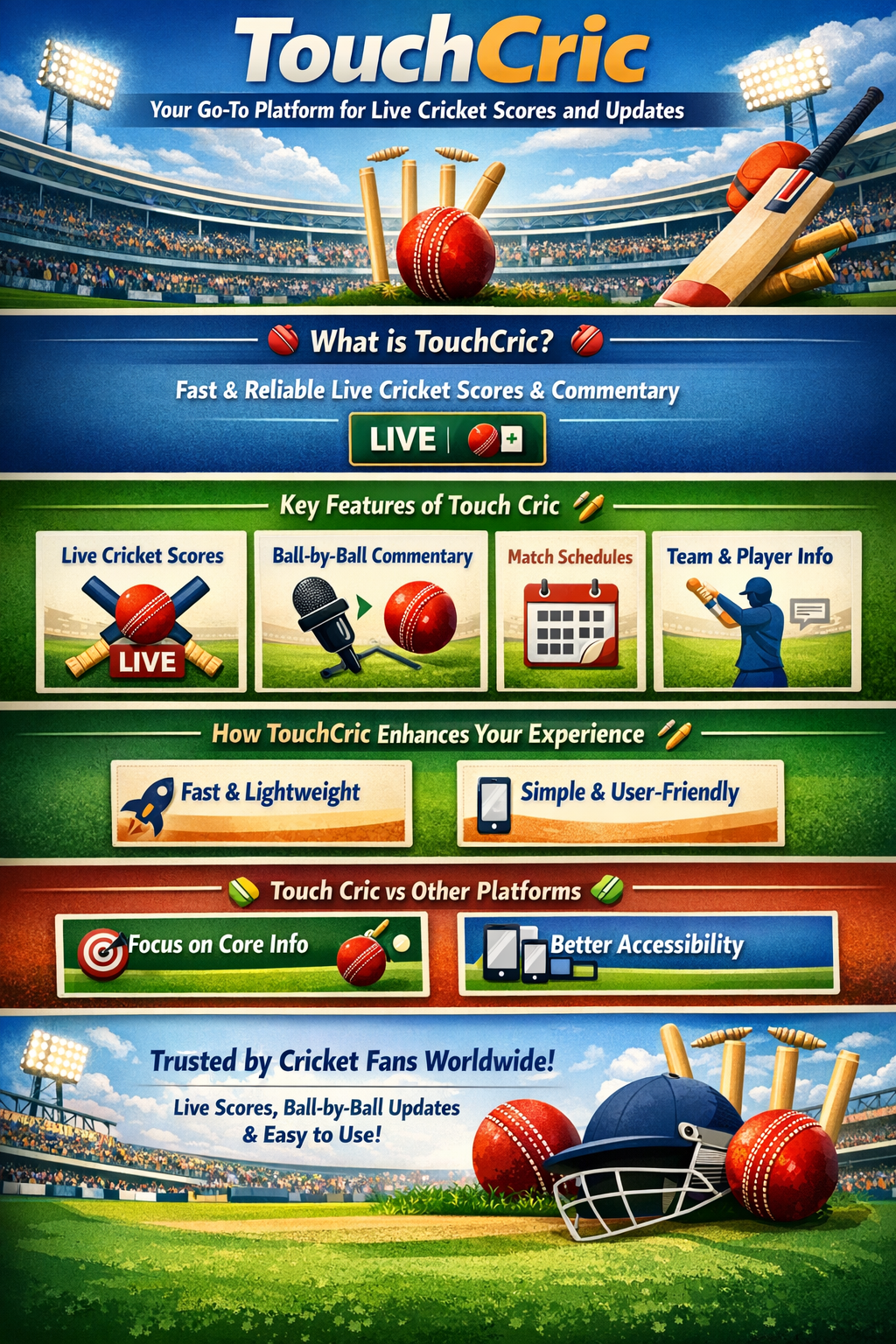 Consistency is the basis of trust, and TouchCric has achieved its status by providing correct and suitable updates in a timely manner. It is preferred by the fans when not live streaming and when they need it most for important games. The reliability of the platform has seen the term touch cric being among the popular things searched by lovers of cricket.