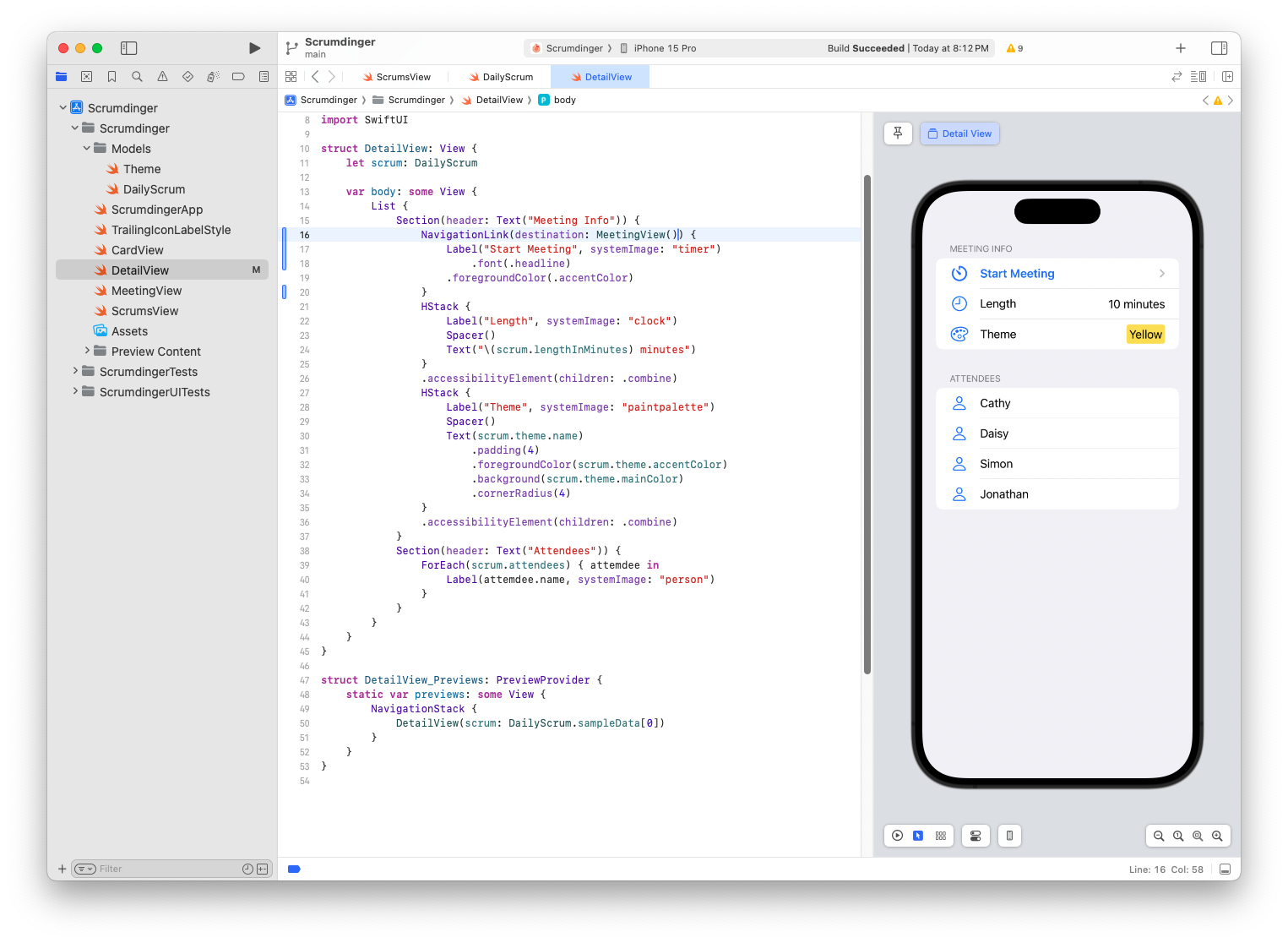 ์ปจํ ์ด๋ ๋ทฐ๋ฅผ ์ฌ์ฉํ์ฌ ๊ณ์ธต ๊ตฌ์กฐ์ ๋ทฐ ์คํ์ ํ์ํ ์ ์์ต๋๋ค. ScrumsView.swift ํ์ผ์์ ๋ฆฌ์คํธ๋ฅผ ๋ํํ์ฌ ๋ค๋น๊ฒ์ด์ ์ ์ค์ ํ ๊ฒ์ ๋๋ค.
