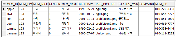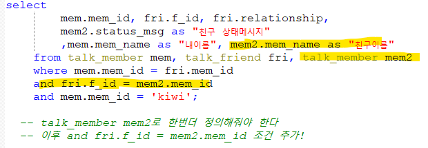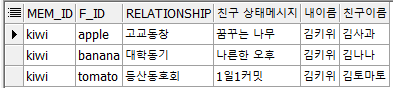 문제: 멤버아이디 : 나, 'kiwi' + 내친구의 이름을 출력