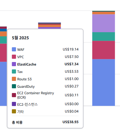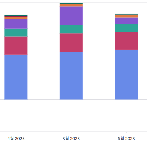 보라색이 ElastiCache For Redis이다. 6월에 교체 작업을 하고 나서 상당히 줄어든 모습이다. 7월은 아직 나오지 않았지만, 6월보다도 요금이 줄어들었다.