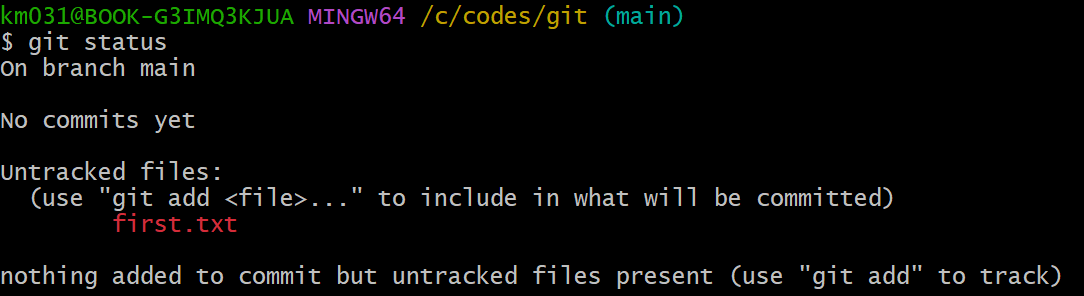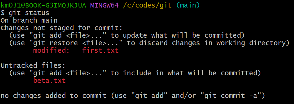 git status : 상태감지. 수정(modified)이있거나 새로운 파일에 대한 목록을 붉은 글씨로 보여줌.
