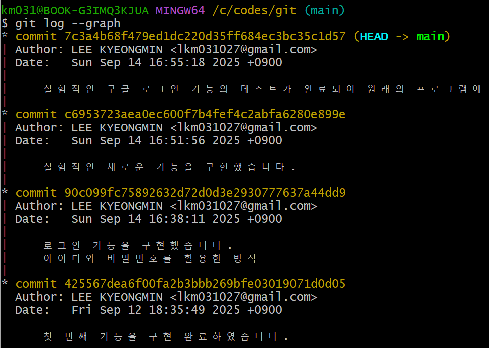 git log --graph : 이전 커밋들 쭈루룩 확인 가능.