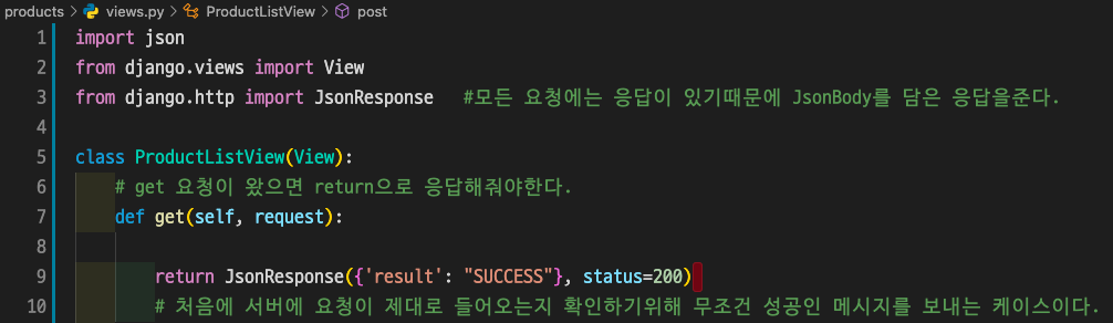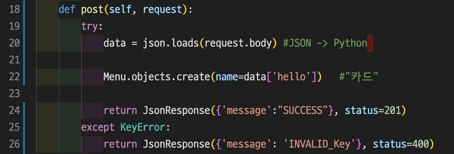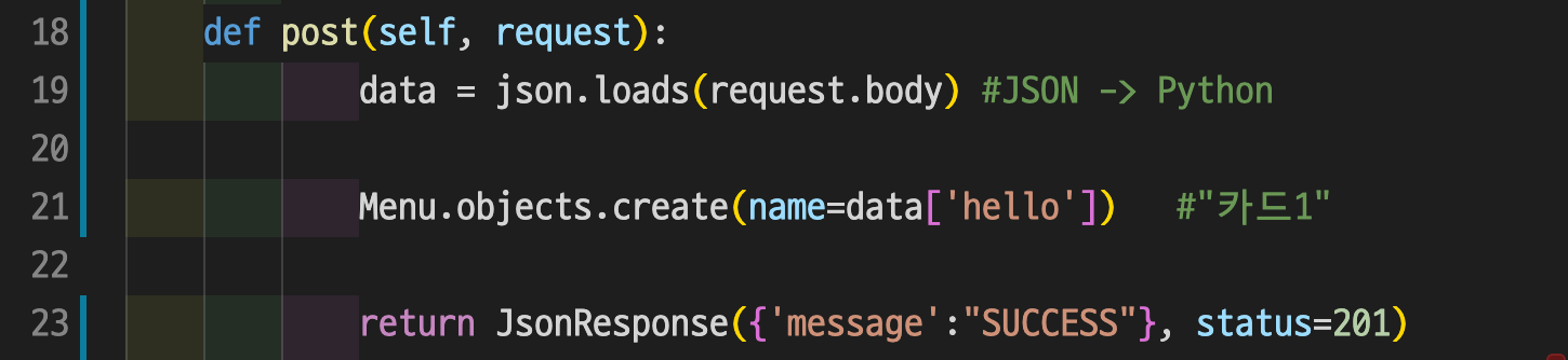 data= 프론트단에서 요청받은 body의 모든내용이 JSON이기때문에 loads라는 메소드를 써서 Python의 딕셔너리 형태로 변경한다.