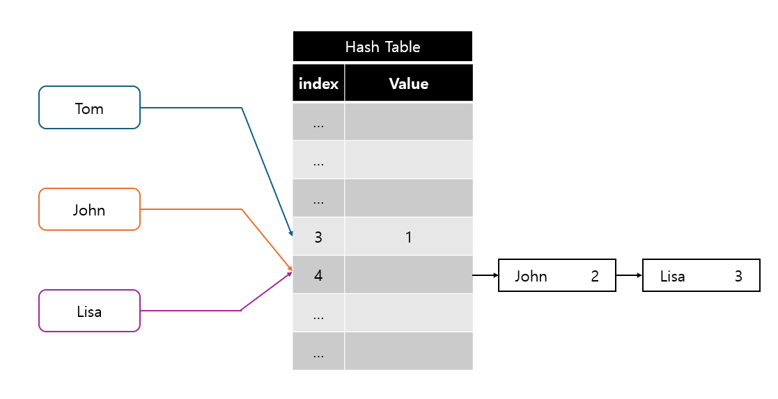 위 그림처럼 4번 인덱스에 연결리스트를 추가하여 John과 Lisa의 데이터를 저장한다.