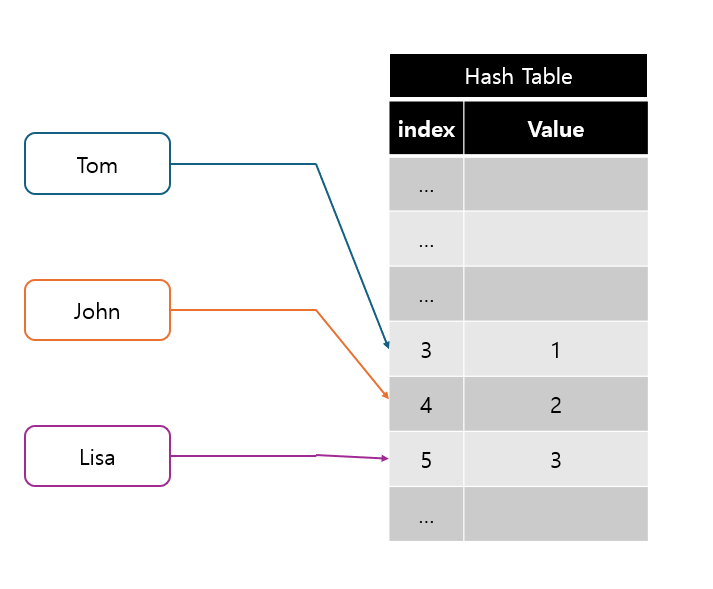 이렇게 데이터를 저장하게 되면 Key 값으로만 데이터를 탐색할 수 있기 때문에 시간 복잡도는 O(1)이 된다.