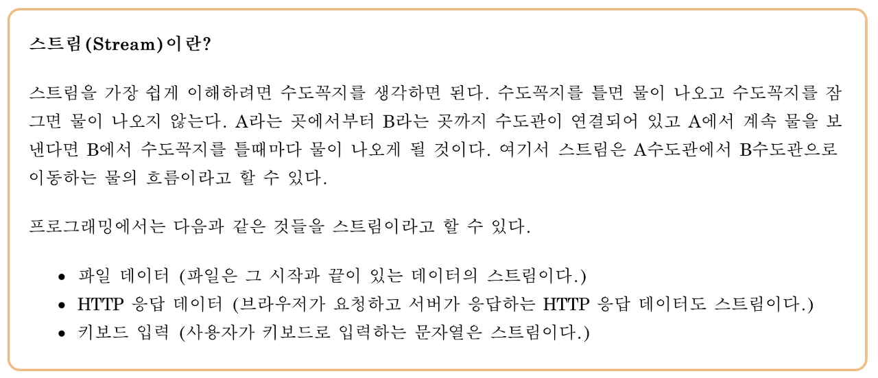 그리고 스트림은 단방향이기 때문에 입력과 출력이 동시에 발생할 수 없다. 그렇기 때문에 용도에 따라 입력스트림, 출력스트림이 나뉜다.