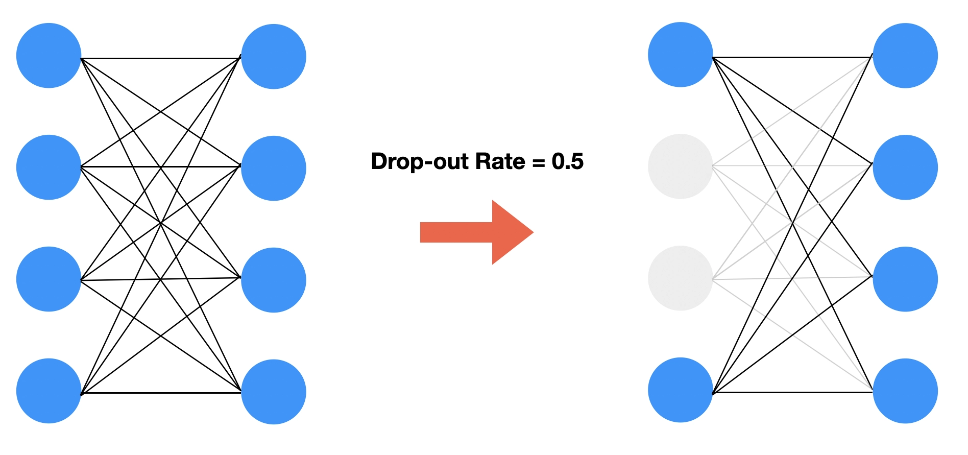 위에 그림처럼 Drop-out Rate가 0.5 라면 50%의 뉴런이 활성화 되지 않는다. 4개의 뉴런중 2개의 뉴런이 활성화 되지 않는 모습이다. 이때 활성화 되지않는 뉴런은 랜덤하게 결정된다.
