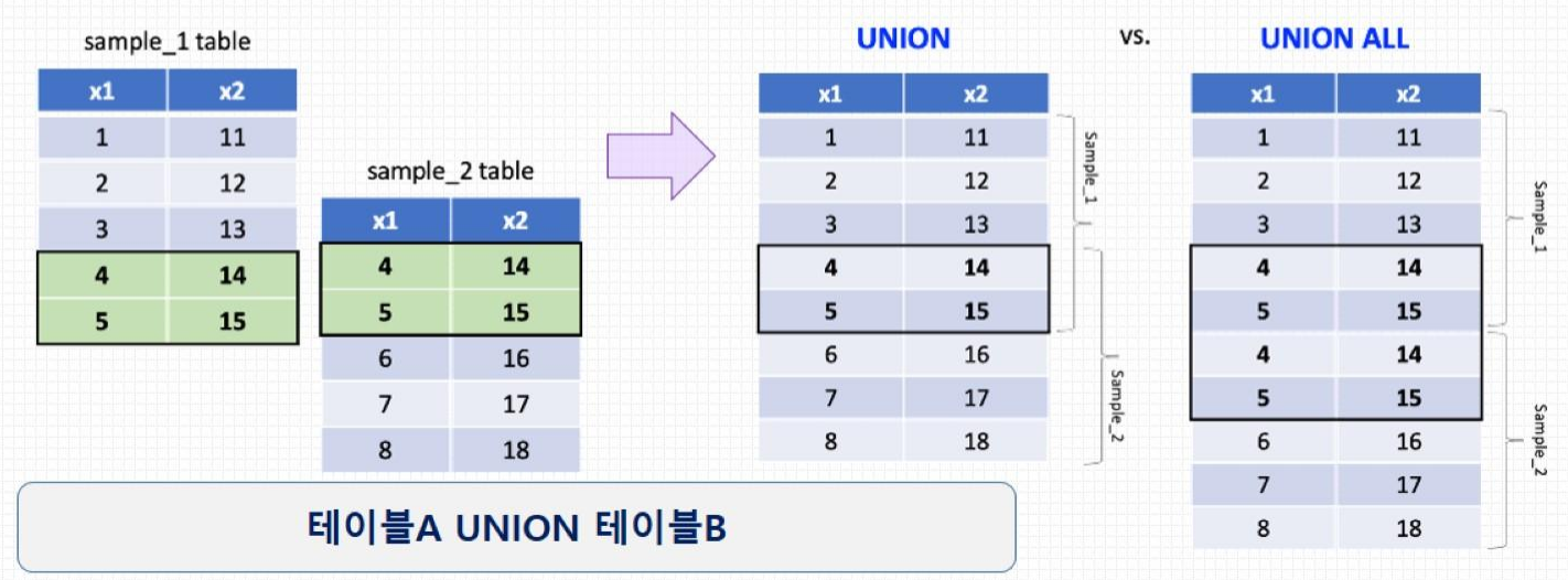 열(Column)구조가 같은 두 쿼리 결과를 행(row) 단위로 붙임