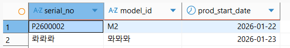 SELECT serial_no AS sn, prod_start_date "생산일자" FROM practice.product_info;