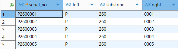 SELECT serial_no, left(serial_no, 1), substring(serial_no, 2, 3), right(serial_no, 4) FROM product_info LIMIT 5;