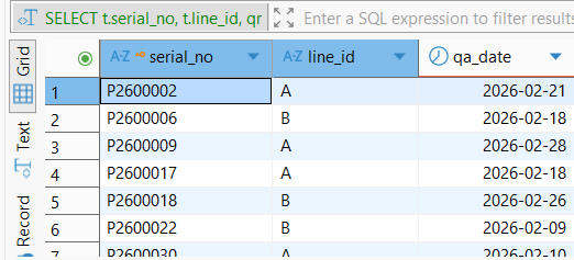 SELECT t.serial_no, t.line_id, qr.qa_date
