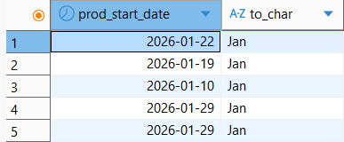 SELECT prod_start_date , TO_CHAR(prod_start_date, 'Mon')