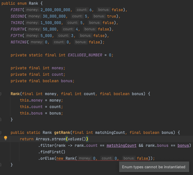 Rank 의 인스턴스로 FIRST, SECOND, THIRD 등을 생성했다. Enum 에서 제공하는 valueOf(name) 을 이용하여 이름으로 랭크 인스턴스에 접근이 가능하다. 당연하지만 선언해둔 인스턴스의 이름과 완전하게 동일해야 한다.