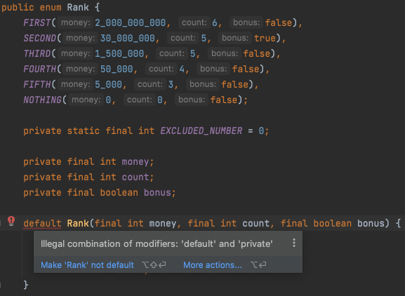 아래 예시는 Enum 클래스 내의 메소드에서 생성자를 호출했을 때 경고가 뜨는 모습이다.