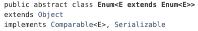 즉, Enum 클래스는 추상 클래스이며 Enum 에 속해있는 값들은 추상 클래스를 상속받아 생성된 인스턴스이다. Enum 은 상수 의 목적으로 만들어졌기 때문에 기본적으로 불변을 보장하며 Enum 클래스 내에서 선언된 객체 외에 별도의 인스턴스를 생성할 수 없다. Enum 클래스 내 메소드에서도조차 안된다.
