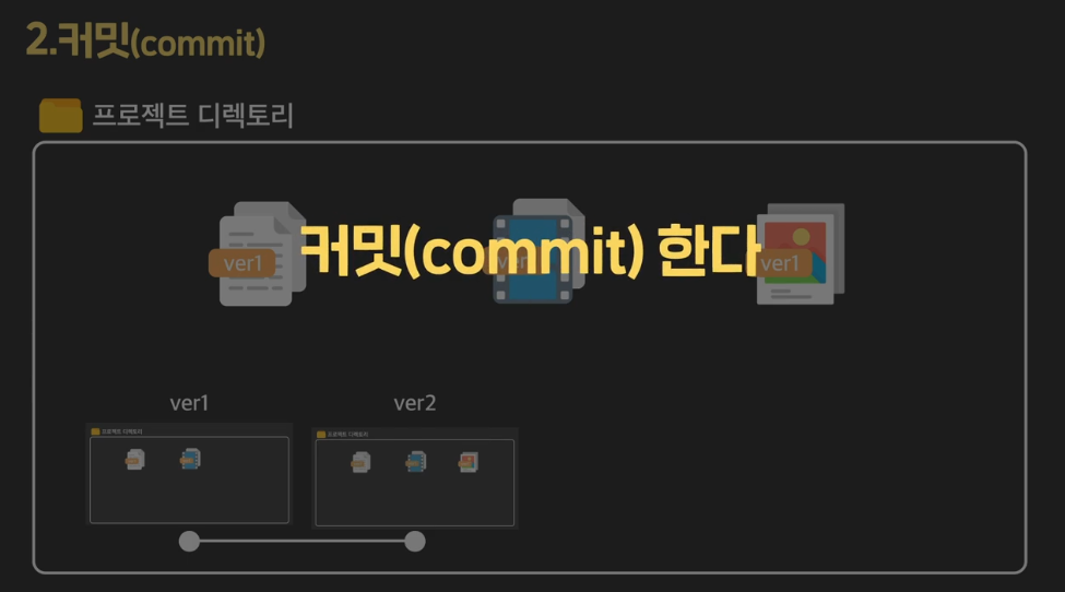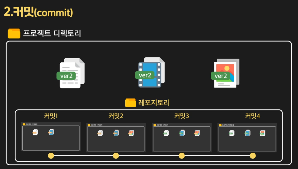 Commit 커밋 = 프로젝트 디렉토리의 특정 모습을 하나의 버전으로 남기는 행위와 그 각각이 버전을 부르는 것