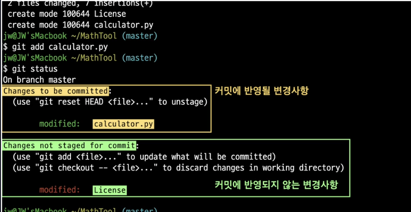 5. 확인하기 : git status, 상단에는 add가 된 변동사항이, 하단에는 변동은 있었지만 stage are에 들어가지 않은 사항이 나온다. 어떤 것을 add했고 안했는지 꼭 확인하고 commit하기!!