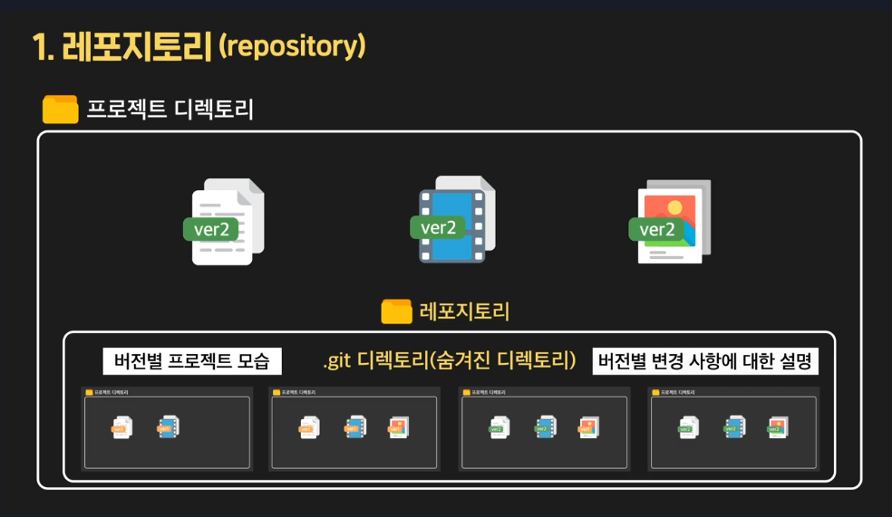 Repository 레포지토리 = 커밋이 저장되는 곳. Git이 원하는 프로젝트의 시점마다 프로젝트 디렉토리의 구성요소의 모습과 변경사항에 대한 설명을 저장하는 곳.