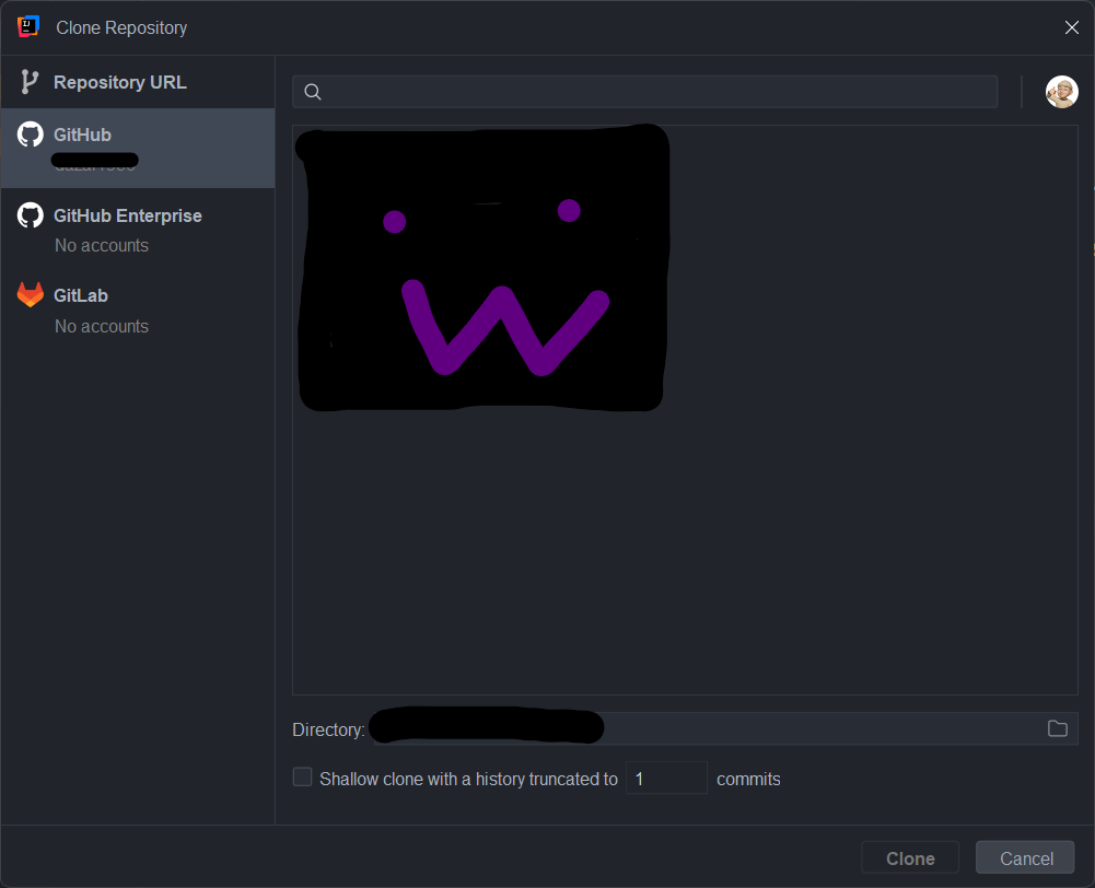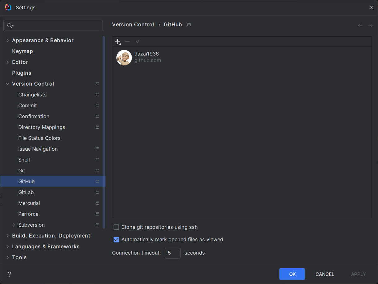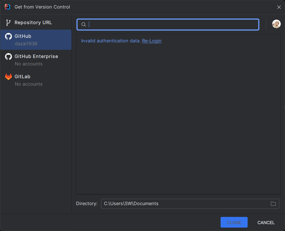 Settings - Version Control - GitHub에 들어가 계정을 지웠다가 다시 등록했다.