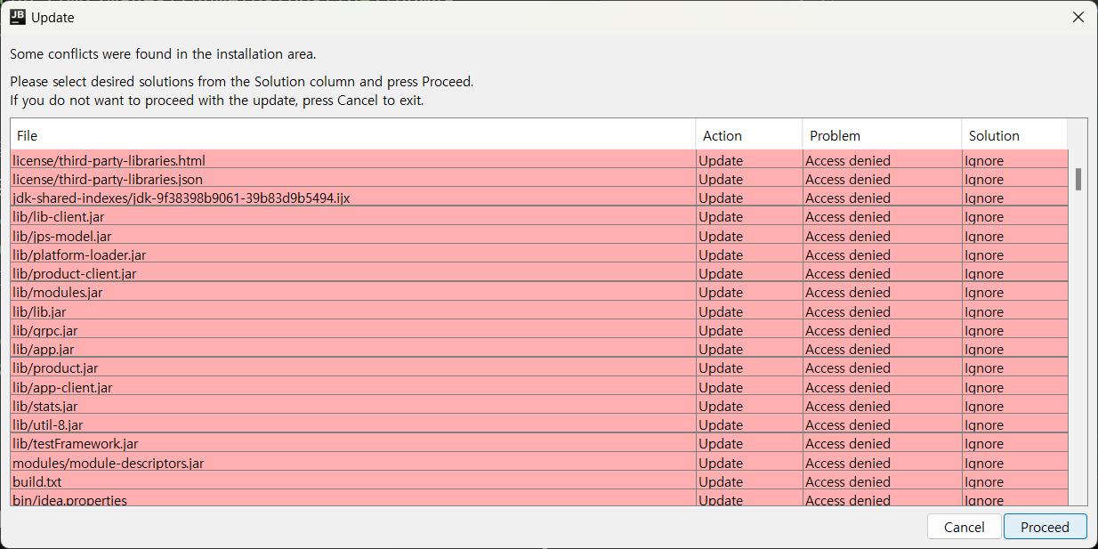 비슷한 문제를 스택오버플로우에서 몇 가지 보긴 했는데 대부분 저기서 Proceed를 눌러도 몇몇 업데이트가 오류로 남는다는 게 너무 찝찝했다. 그래서 결국은 재설치.