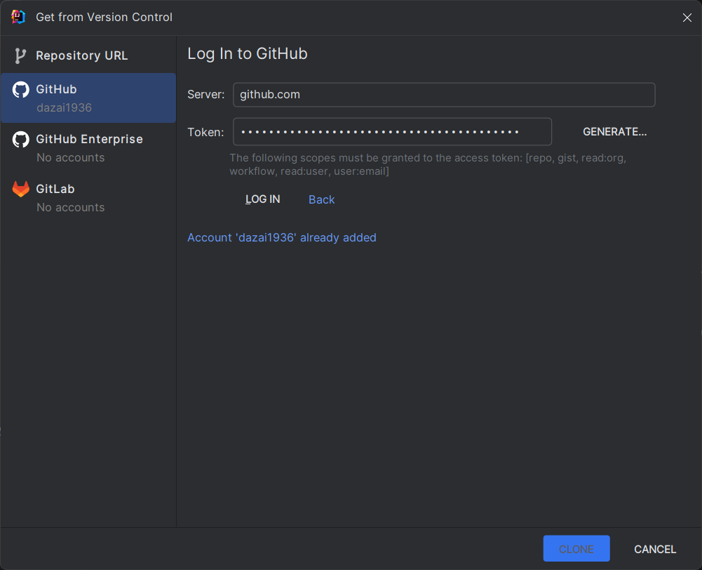 Generate new token을 누르고 필요에 맞게 세팅한다.(난 만료기간 무제한으로 해버렸다.) 토큰을 생성하면 키값이 나오는데, 페이지를 나가면 다신 알 수 없으니 따로 복사해두자. 이제 발급받은 토큰을 IntelliJ에 다시 적용하면
