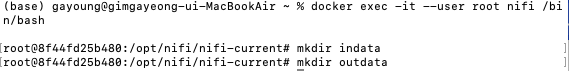 나는 도커에서 nifi를 실행하기 때문에 컨테이너에 들어가서 디렉터리와 txt 파일을 만들도록 하겠다.