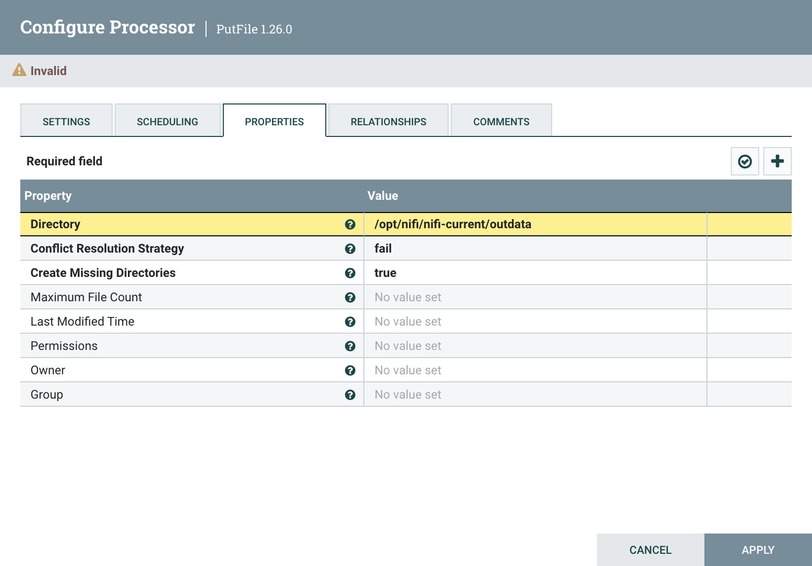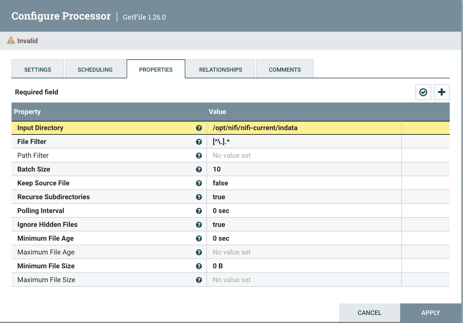 각 Processor를 우클릭한 뒤, Configure에 들어가서 properties를 설정해준다.