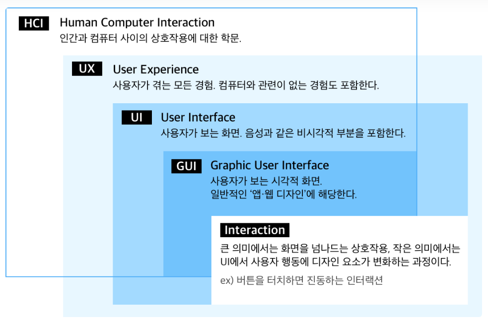 UI는 음성과 같은 비시각적인 부분을 포함하는 것이고 GUI는 시각적 화면만을 뜻한다고 한다.